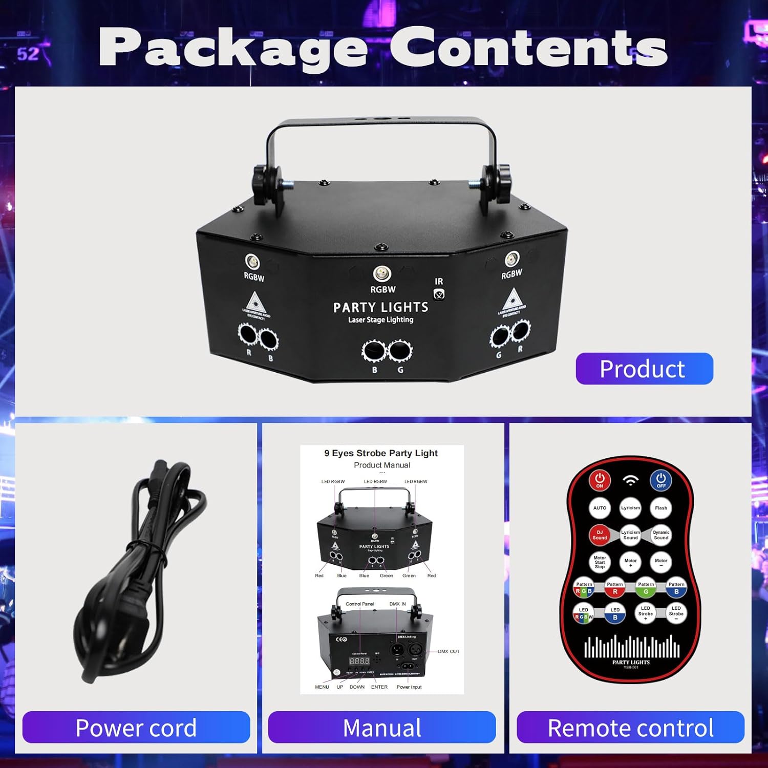 | Included Components | 1*DJ Party Light 1 * Remote Control 1 * Data Line 1 * User Manual 1 * DJ Light Stand 2* Screws |
