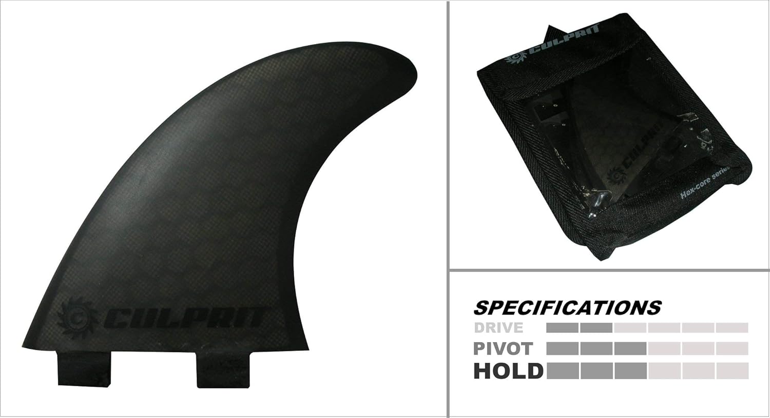 The Culprit Surf RTM Honeycomb fin features cutting edge foil design which combines excellent balance of base length, height and sweep that gives these fins good drive, grip and optimum maneuverability. The combination of the above features with its light weight foam core results in a high performance fin without the high performance price. Set of three (3) fins.