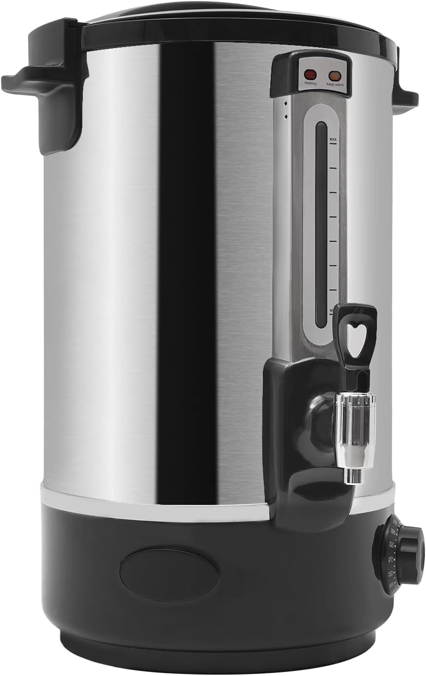 Upgrade your hot water needs with our commercial electric hot water bucket, designed for efficiency, safety, and convenience. This high-quality appliance features a sturdy stainless steel shell and a 304 stainless steel liner, ensuring durability, wear resistance, and long-lasting performance. With its powerful 2200W heating plate and double-layer construction, it heats water quickly and evenly, maintaining warmth for up to 4-5 hours even after the power is turned off. The 4-gallon capacity is perfect for serving multiple people at once, making it ideal for offices, cafes, hotels, and large gatherings. Enhanced with anti-dry burn protection, a water level window, and a user-friendly design, this hot water bucket offers a seamless experience for both commercial and personal use.SpecificationsMaterial: Stainless Steel, 304 Stainless SteelSurface Treatment: SandingColor: Silver, BlackStyle: ModernShape: RoundAssembly Required: NoMount Type: Free Standing, TabletopPlug Type: US StandardPower Source: Corded ElectricCapacity: 20L/5.3galActual Capacity: 15L/4galPower: 2200WTemperature Range: 30-110℃/86-230°FVoltage: 110VHeating Method: Heating PlateInsulation Time: About 4-5H(After Power Outage)Gross Weight: 5kg/11lbsNet Weight: 3.75kg/8.3lbsBucket Outer Size(D*H): 26.5*53cm/10.43*20.87 inchBucket Inner Size(D*H): 23*36.5cm/9.06*14.37 inchPackage Size: 57*31*31cm/22.44*12.2*12.2inPackage Included1* Commercial Electric Hot Water BucketNotesPlease allow the slight color difference caused by the shooting light and 1-3cm error due to manual measurement, and make sure you do not mind before you order.