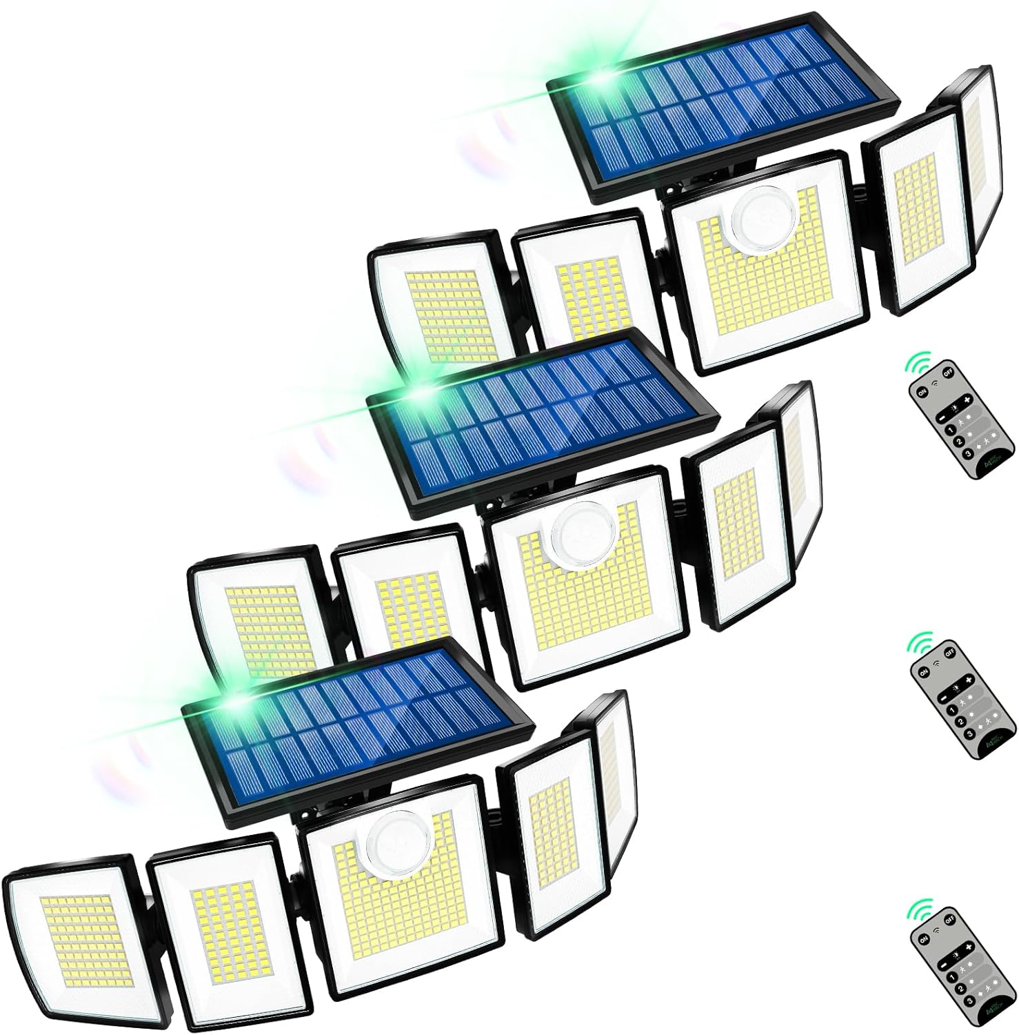 | Other Special Features of the Product | 2400mAh Large Battery Capatity 5000 hrs lifespan, 391 LEDs 7000K 3000LM IP65 Waterproof, MDCMDCM Smart PIR Motion Sensor Solar Lights Outdoor 360°Ultra-Wide Adjustable Design, Remote Control 5 Heads Security Lights, Split Solar Panel Design 3 Levels Brightness 3 Lighting Modes |